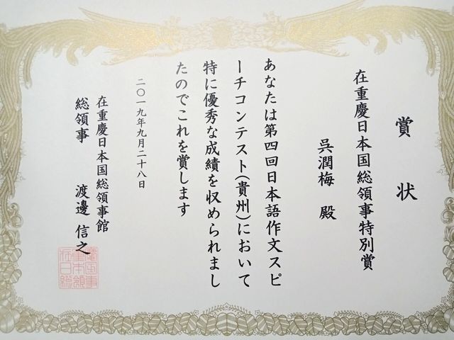 下午2点半进行的贵州省第四届作文演讲大赛中,日语系17级的吴润梅在日语系老师王晓雲、外教长尾康岐的指导下,以 “何时何地都可以喝到新鲜的牛奶”为主题的精彩演讲在五大高校代表队的激烈角逐中脱颖而出,荣获三等奖,由于触动人心的即兴演讲,同时还是唯一一位获得驻重庆日本总领事特别奖的选手,斋藤宪二副领事在颁奖时说道,“相信大家都能感觉到刚才被触动了的心”。