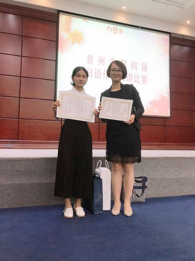16级翻译班的杨金枝和16级商务英语的蔡诚成,在日语系教师王晓雲的指导下,与来自贵州大学、贵州民族大学、贵州师范大学、安顺学院、凯里学院、重庆交通大学、贵阳学院、贵州大学科技学院、凯里实验高中、盘州市第七中学十所学校的选手同台竞技,获得优秀奖。