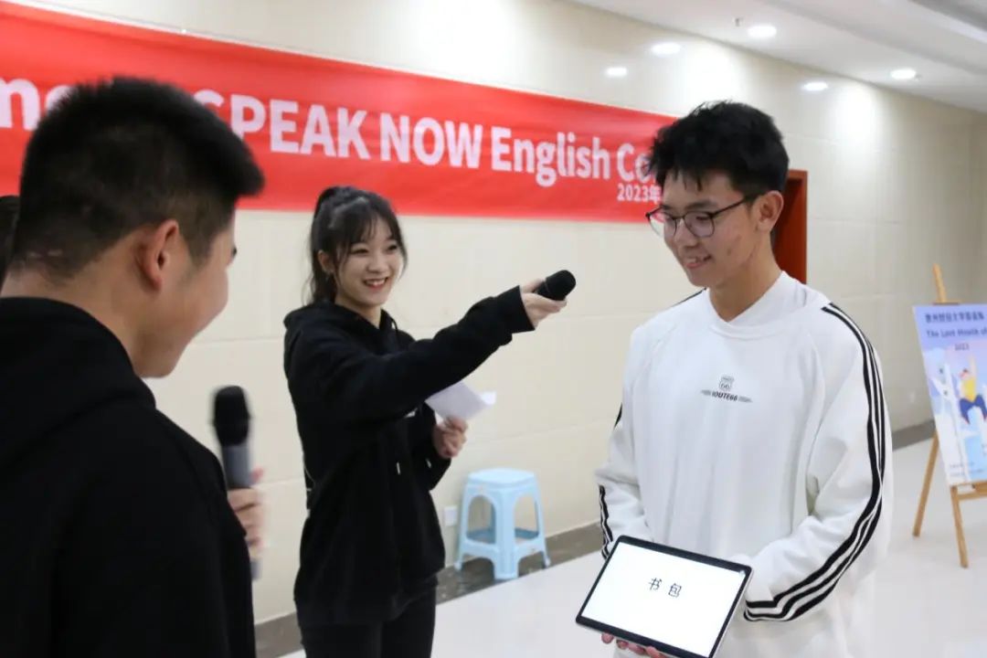 在“绕口令”环节,随机邀请八名同学,两人一组进行比拼,同时开始朗读一段英文绕口令,速度最快的并且完整度最高的同学获胜。同学们竭尽所能,锻炼同学们的英语口语表达能力的同时,也给现场的其他同学带来欢乐,将现场气氛推向高潮。