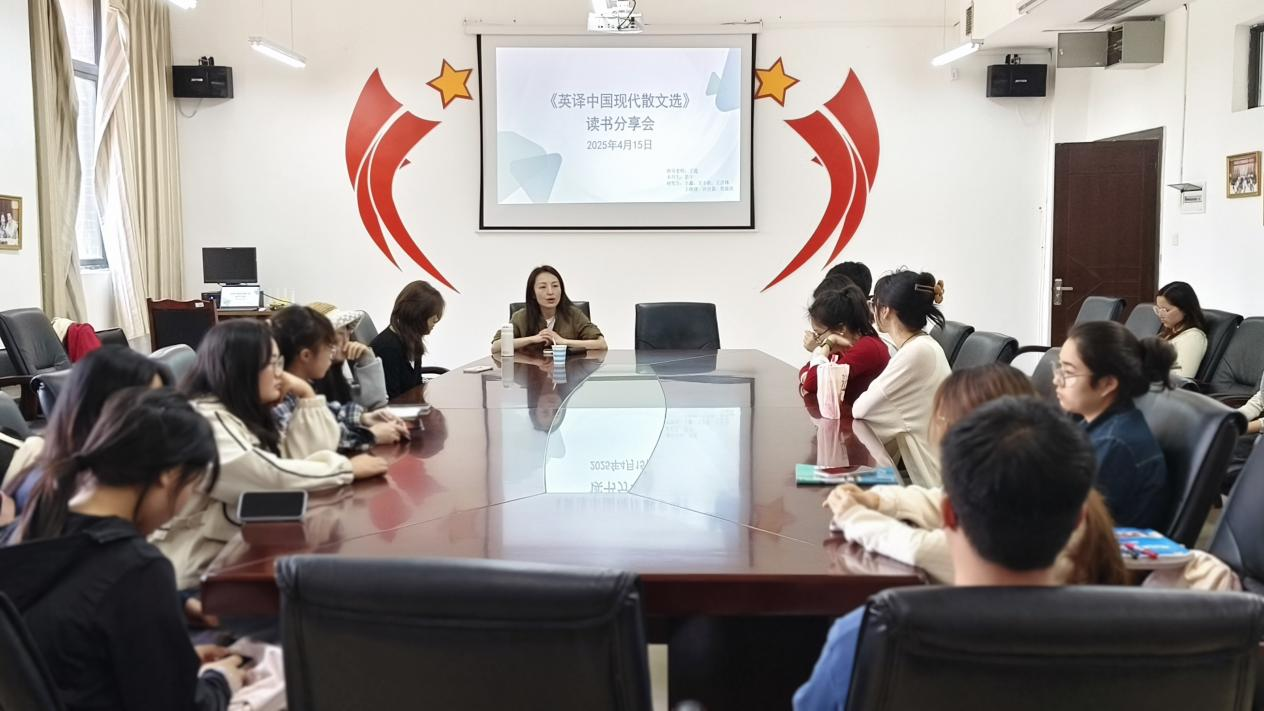 今年适逢第30个世界读书日,为激发同学们的阅读热情,提升英语专业学生的翻译素养与文学鉴赏能力,促进学术交流,4月15日中午,《英译中国现代散文选》读书分享会在励学楼301活动室顺利举办。本次分享会由MTI导师王莲主持,吸引了学院众多研究生和本科生踊跃参与。