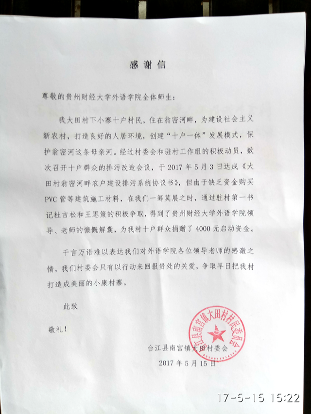 党委高度重视,一方面积极发动教师党员捐款,另一方面安排驻村干部王思策合理策划资金捐赠的方案,确保“放水到田”,要求实现精准帮扶的同时做好群众工作,激发群众内生动力。在学院党委的安排下,5月3日王思策回村组织群众签订《大田村翁密河畔农户建设排污系统协议书》,重点约定了群众出工投劳的方式并约定对施工中完成厕改的群众进行奖励,组织群众到施工现场测量施工建设材料并精确预算造价。在一系列前期工作完备后,5月15日,王思策和公管学院选派到大田村的第一书记杜吉松到大田村为群众送去了4000元捐款。