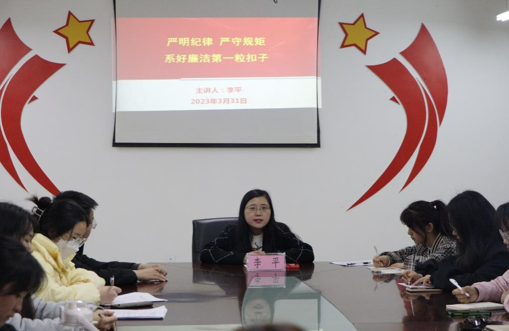 纪委书记李平在励学楼301会议室为2023年春季入党积极分子培训班作专题讲座,讲座题为“严明纪律,严守规矩,系好廉洁第一粒扣子”,培训班全体学员参加。