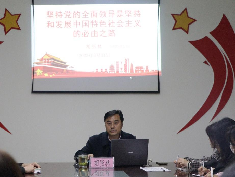 党委书记胡张林在励学楼301会议室为2023年春季入党积极分子培训班作专题讲座,讲座题为“坚持党的全面领导是坚持和发展中国特色社会主义的必由之路”,培训班全体学员参加。