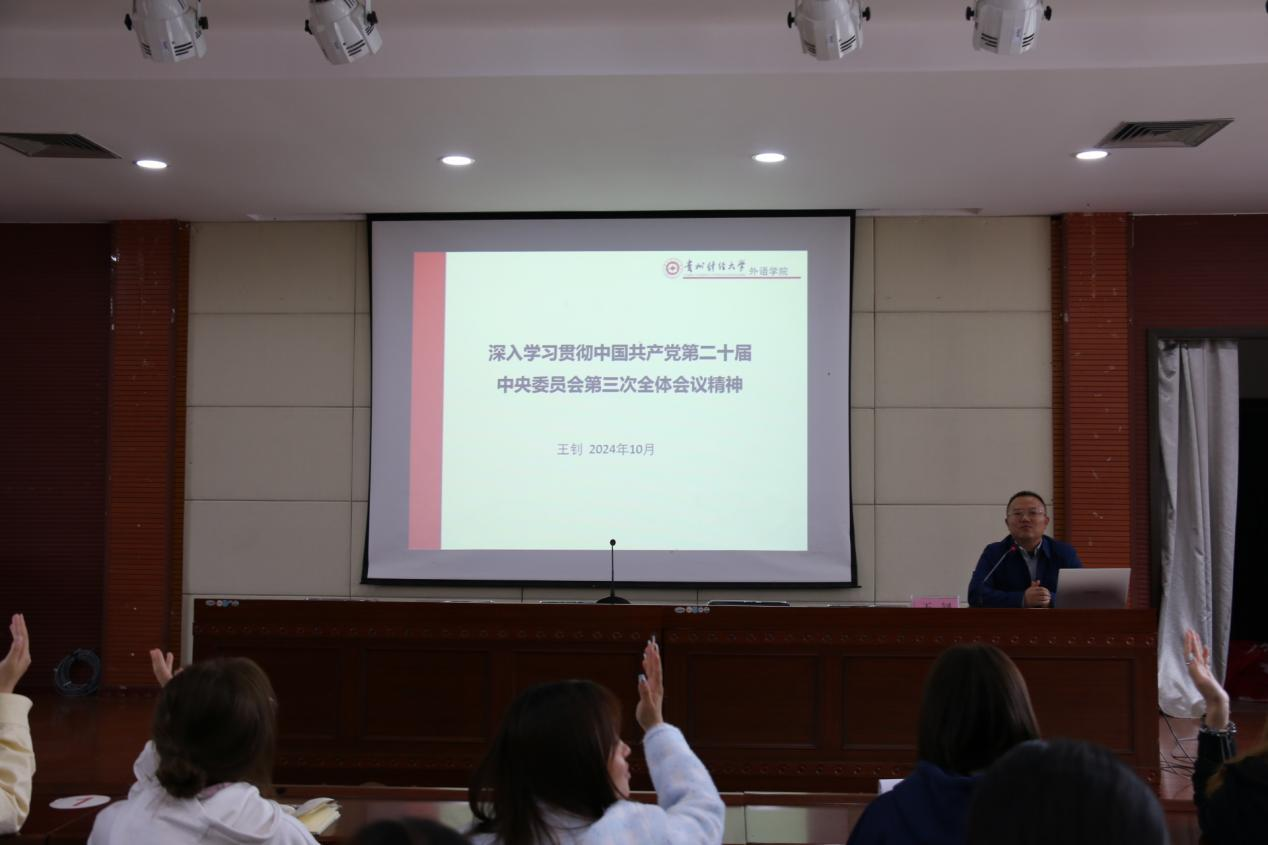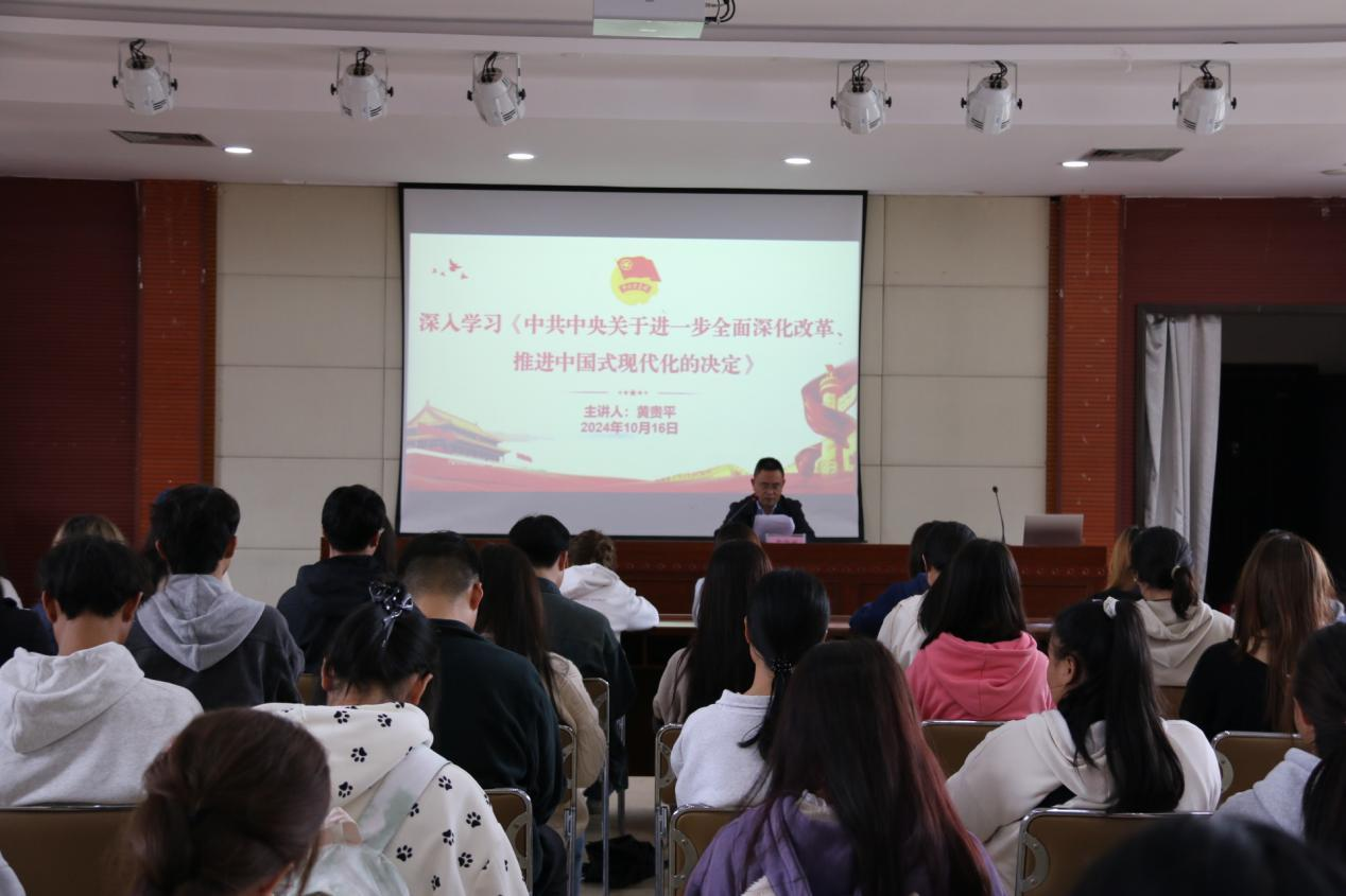 汪欢全面而深入地介绍并解读了党的二十届三中全会精神,首先提及《中共中央关于进一步全面深化改革、推进中国式现代化的决定》中提出的超过300项重要改革措施,这些措施均聚焦于体制、机制及制度层面的深刻变革。紧接着,强调深化改革的六条核心原则,认为这是推进改革不可或缺的指导方针。汪欢指出,《决定》将高质量发展确立为全面建设社会主义现代化国家的首要任务,并对经济和民生领域的改革进行了全面且细致的规划布局。此外,他还特别提到了《决定》对于深化教育、科技、人才体制机制一体化改革的重要部署,以及关于党的领导和党的建设制度改革的关键内容。最后,汪欢希望同学们能以高度的政治责任感和使命感,认真学习并深刻领会全会精神,确保思想和行动与全会精神保持高度一致。