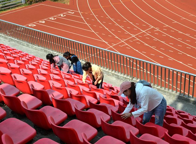 劳动现场,色色动漫 学子们不怕脏、不怕苦、不怕累,认真清扫看台区域,有的用扫帚清扫地面,有的忙着把废纸、塑料袋等装进垃圾带,有的用抹布擦拭座位。