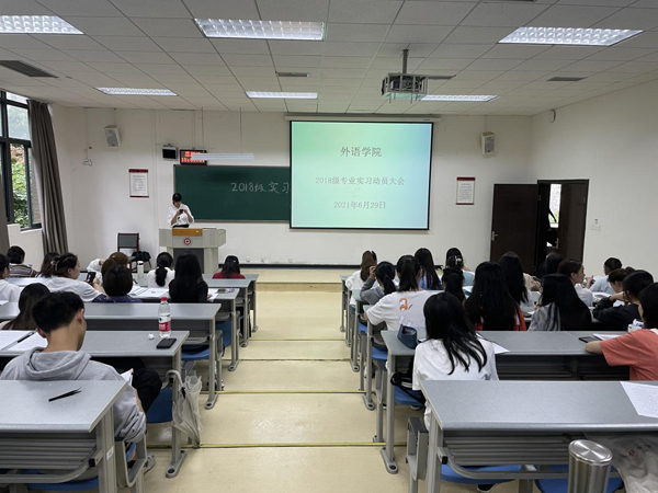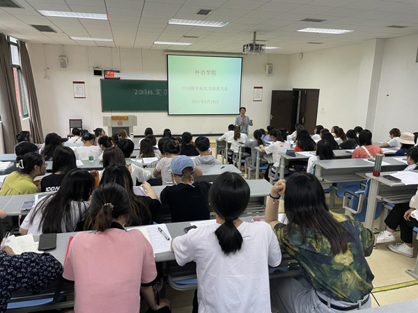 院长张虹、学生科副科长康维、英语系主任王景洁、日语系主任袁先婷、西语系教师王亚娇莎、教务科老师张迪及2018级全体同学参加了此次实习动员大会。