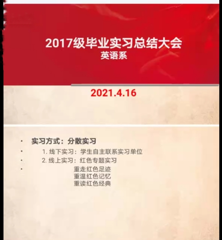 毕业实习负责人肖菊老师及2017级英语系全体同学通过腾讯会议共同参与了此次线上会议。