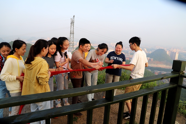 在校毕业班学生在辅导员王思策的带领下迎着清晨的朝阳爬上大学城的最高峰——斗篷山山顶,并在山顶举行签名仪式,号召色色动漫