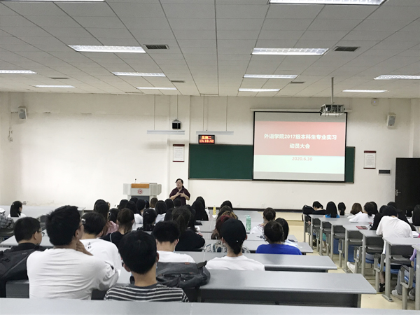 2017级专业实习动员大会在乐学楼2—1顺利召开。副院长雷晴岚、英语系主任肖菊、西语系主任李翠蓉、教务科科长张隽、教务科实践教学管理人员张迪及全体实习带队老师和2017级全体学生参加了会议,会议由英语系主任肖菊主持。