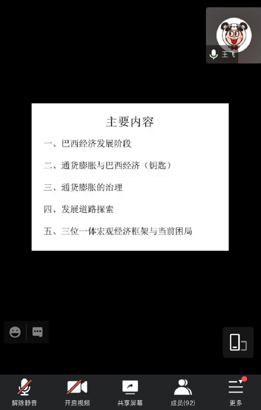 2021年1月11日晚,中国社会科学院拉丁美洲研究所助理研究员王飞博士以“巴西经济:增长与发展”为主题,分别从巴西经济发展阶段的划分、通货膨胀与巴西经济、通货膨胀的治理、雷亚尔计划与巴西金融动荡与三位一体宏观经济框架与当前困局五个方面生动形象地分析阐述了巴西经济的增长与发展,并提出了财政整顿、央行独立性与货币政策和汇率政策协调配合等措施与参照。