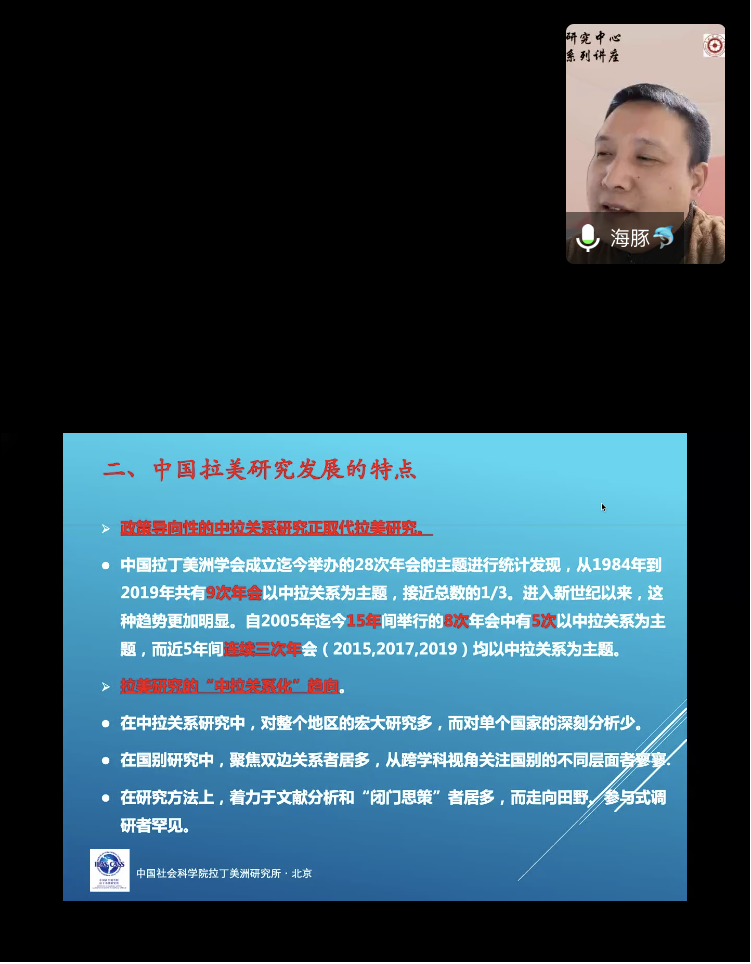 拉丁美洲研究中心于2020年12月21日至2021年1月18日期间成功举办“走进拉美研究”系列五场讲座。2020年12月21日晚,通过线上的形式开始了系列讲座的第一场,主题为“中国的拉丁美洲研究:发展与挑战”,主讲专家为中国社会科学院拉丁美洲研究所社会文化研究室主任、阿根廷研究中心执行主任、中国社会科学院登峰战略拉美文化学科负责人、新华社中国经济信息社特约分析师郭存海博士。色色动漫