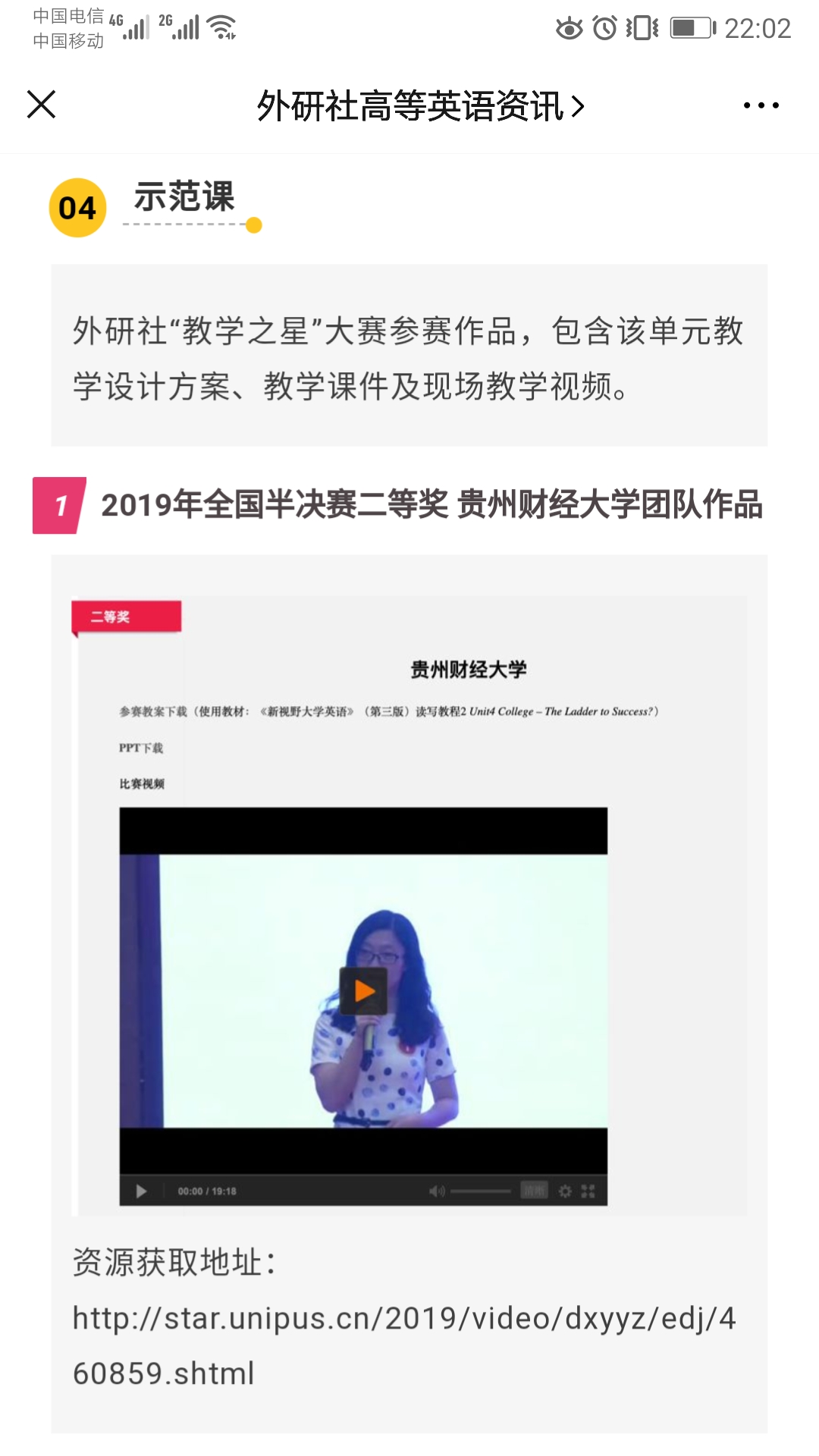 肖菊老师带领的外研社“教学之星”参赛团队(肖菊、吴德宇、雷晴岚、尤春芝、熊晶晶)的教学视频作为优秀示范课,被外研社选取为《新视野大学英语》(第三版)系列教材教学素材面向全国教师发布。肖菊老师凭借专业扎实的教学功底和精巧新颖的课堂设计,曾带领团队在2019年外研社“教学之星”大赛全国复赛中获得特等奖,并在全国半决赛中取得二等奖的好成绩。