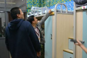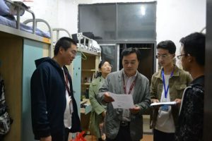 首先学院一行人来到的是樱花苑二栋的男生寝室,并在寝室走访过程中学院领导与新生亲切交谈,询问他们到校后的住宿和饮食情况;提醒新生们要注意平时的用电安全,切记不能违规使用大功率电器;注意防范上门推销人员,以防上当受骗,注意出门一定要锁门,防止重要物品钱财丢失。特别叮嘱新生在军训期间要合理饮食、注意身体,有困难及时向辅导员和学院老师反映。同时,希望新生们从入学之初便养成良好的生活习惯并持之以恒的坚持下去。走访期间,气氛融洽,师生们交谈愉悦。