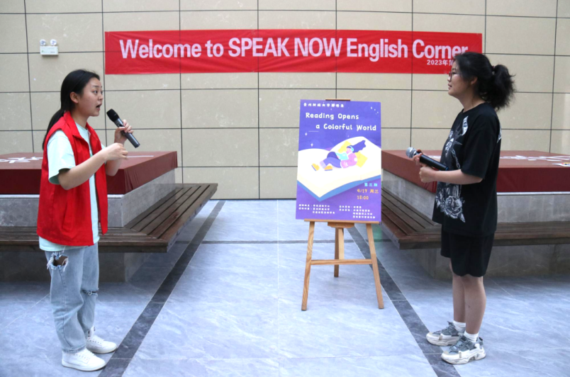 团委承办的Speak Now英语角第三期活动于大礼堂学生活动中心顺利开展。为迎接即将到来的世界读书日,引导同学们多读书,读好书,营造书香校园,本期英语角主题为“Reading Opens a Colorful World”。
